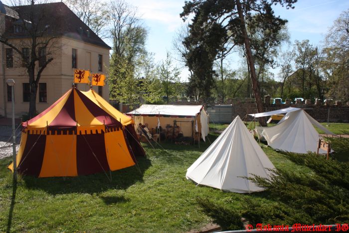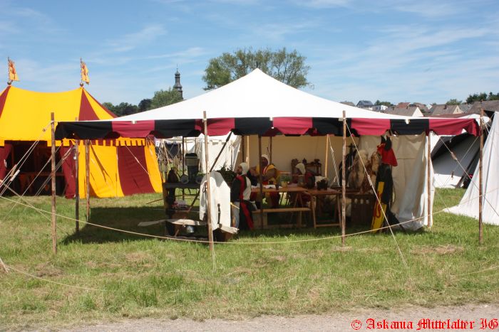 Unser Lager besteht zur Zeit aus drei Zelten, welche begehbar und mittelalterlich eingerichtet sind, sowie einer Feldküche mit Feuerstelle und einer Überdachung mit einer mittelalterlich gestalteten Tafel. Die Größe des komplett aufgebauten Lagers beträgt ca. 20 x 20 Meter.